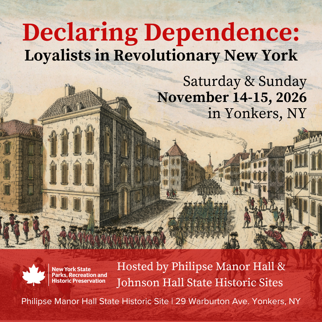 As we mark the 250th Anniversary of the American Revolution, Philipse Manor Hall State Historic Site and Johnson Hall State Historic Site are partnering to highlight the experiences of Loyalists in New York throughout the war. They will host a public symposium, “Declaring Dependence: Loyalist in Revolutionary New York” on November 14-15, 2026 at Philipse Manor Hall State Historic Site (29 Warburton Ave.) in Yonkers, NY. The symposium will take place in-person and will also be broadcast online.